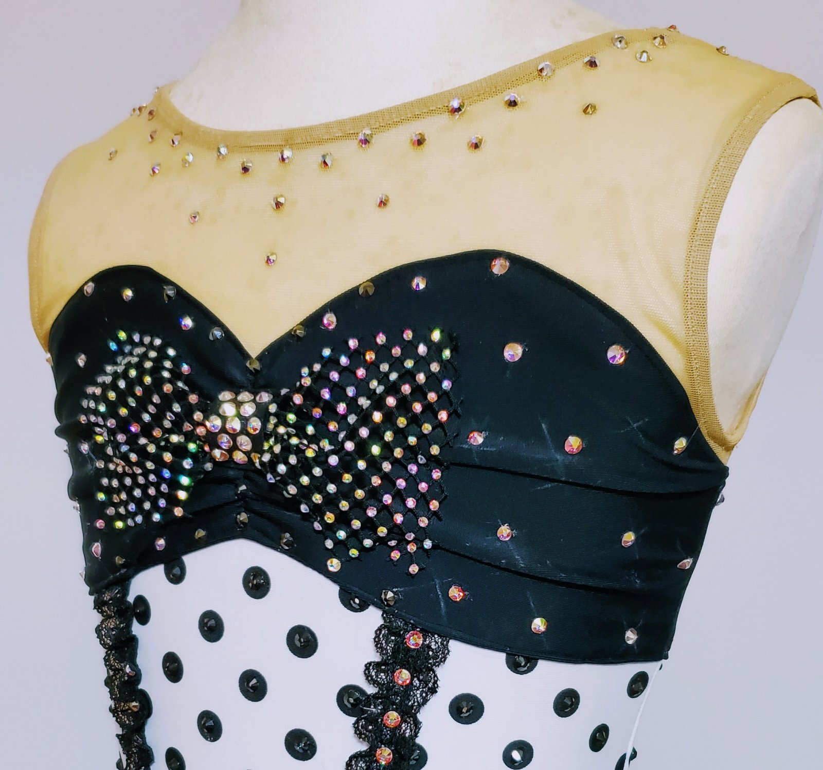黒の水玉の上にブラックのラインストーンを付けてあります。